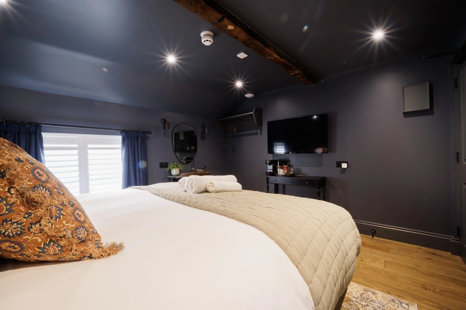A stylish bedroom which boasts a Super King Bed and a spacious ensuite bathroom with a Walk-In Shower.